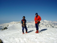 5月4日、避難小屋6:00発。北の俣への斜面を2300mまで登り、太郎山手前へトラバース。雪もしまっており、地形を読みながら森に谷にルートを取り、結構楽しい。太郎平小屋9:50着。薬師峠からひたすら登って薬師岳山頂14:30。快晴の中、360度の展望。足元には金作カールとそれに続く金作谷の急斜面が魅惑的。すぐ目の前には薬師見平から赤牛岳の重厚な山並が聳えている。行ってみたい衝動に駆られるが、冷静に考えて時間的に無理と判断し、赤牛岳は諦めた。