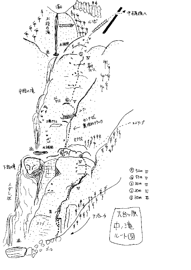ルートをそのまま滝に取ったメンバーは、4P 核心部 浮石の詰まった垂直に近いクラック50メートル、5P 50メートルを経て上段のテラスへ。この上は右側の樹林帯にルートを求め3時半に帰着。
