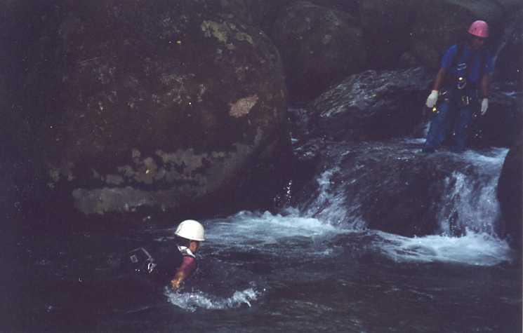 腰まで水に漬かり釜を渡る川村君と池内君