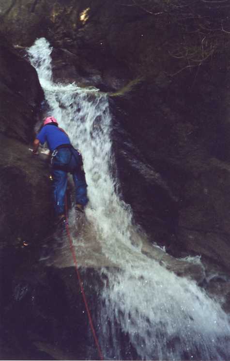 本日のメイン、空身になってハ−ケンを打ち滝を登る池内君