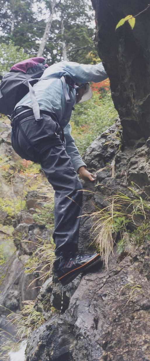 滝の側壁を登る塩崎、膝から下が濡れているのが分かります。ジャブジャブ歩いてから取りつきました。