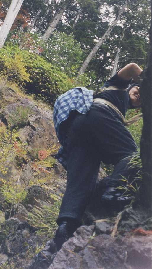 背の足りない森本さんはザイルの助けを借りて登ってます。