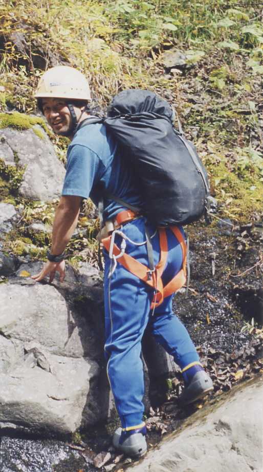 二日酔いでも元気な山本君。彼の靴はフェルト底の本格的沢靴です。