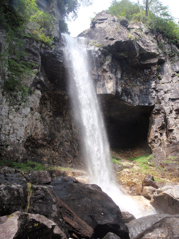 洞窟の滝65m。滝の裏を通って左岸ルンゼへ。